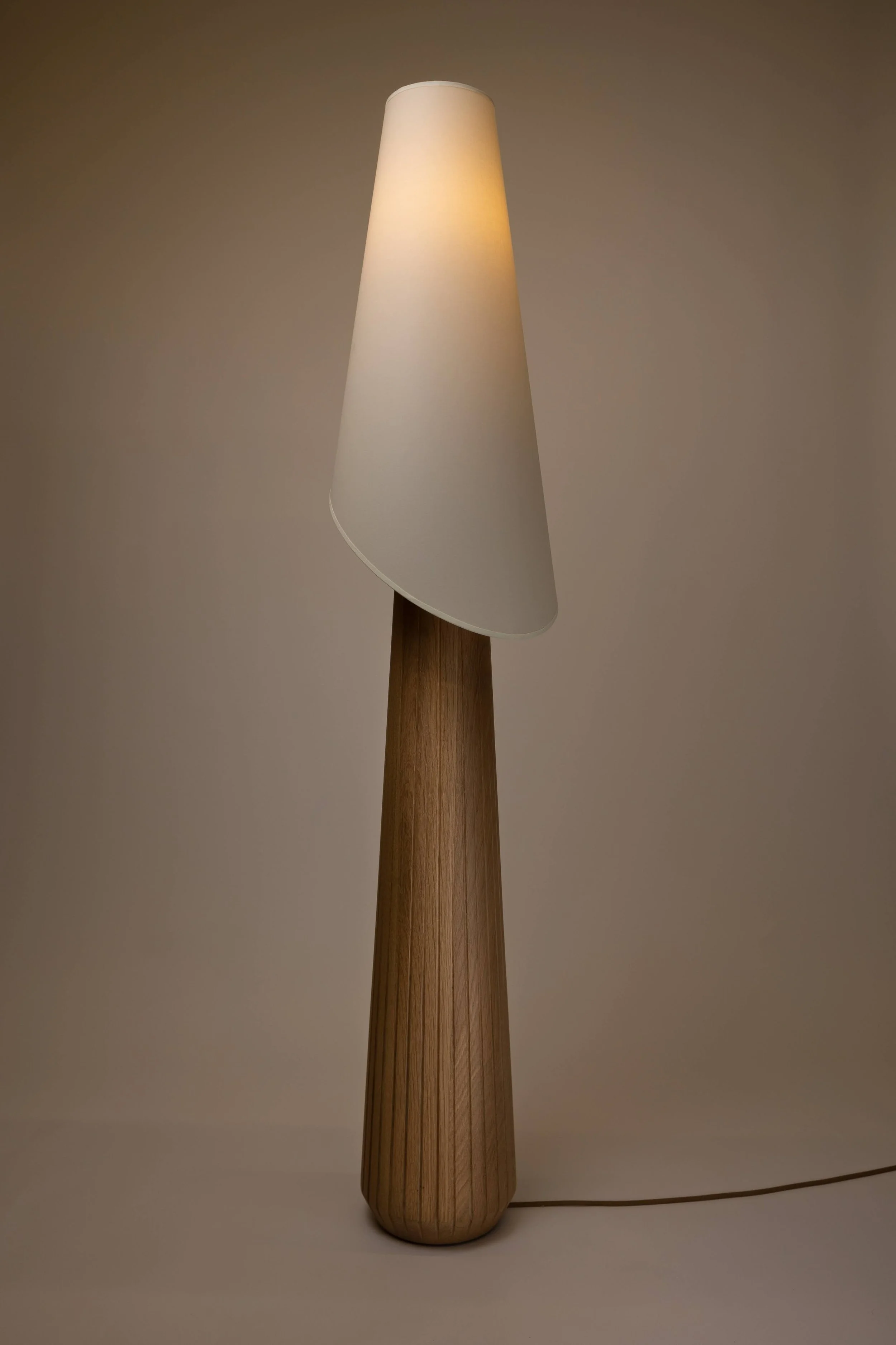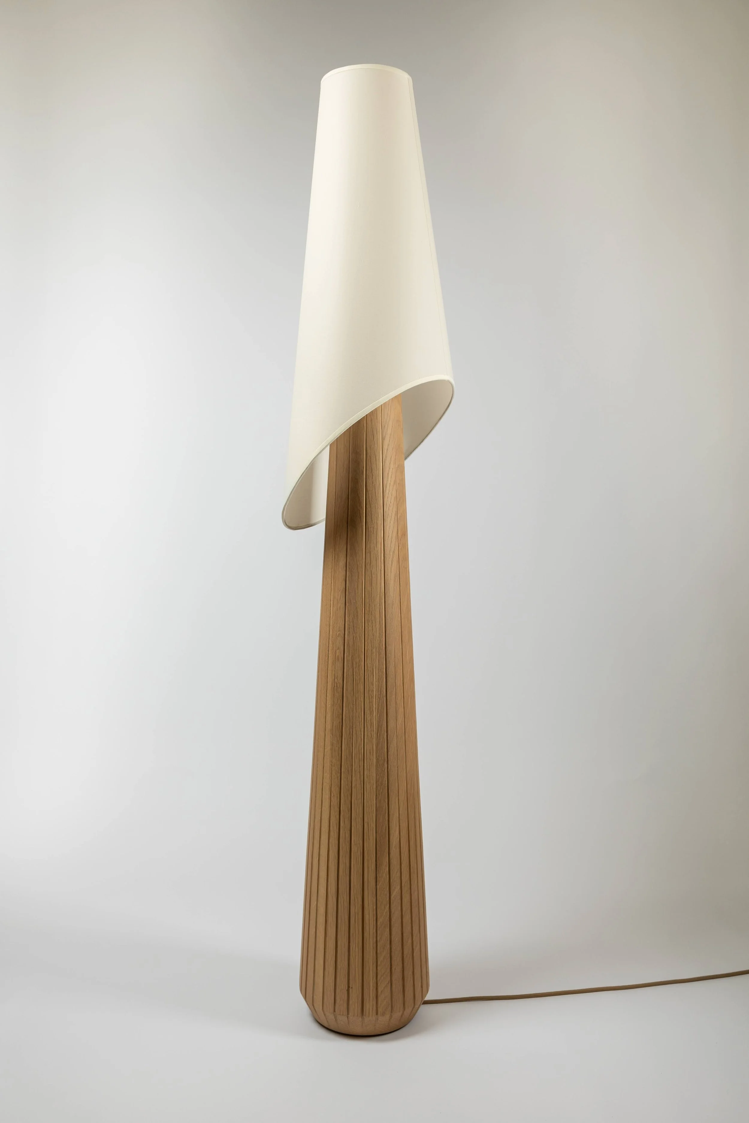 Turned and fluted solid white oak floor lamp with a white linen shade.