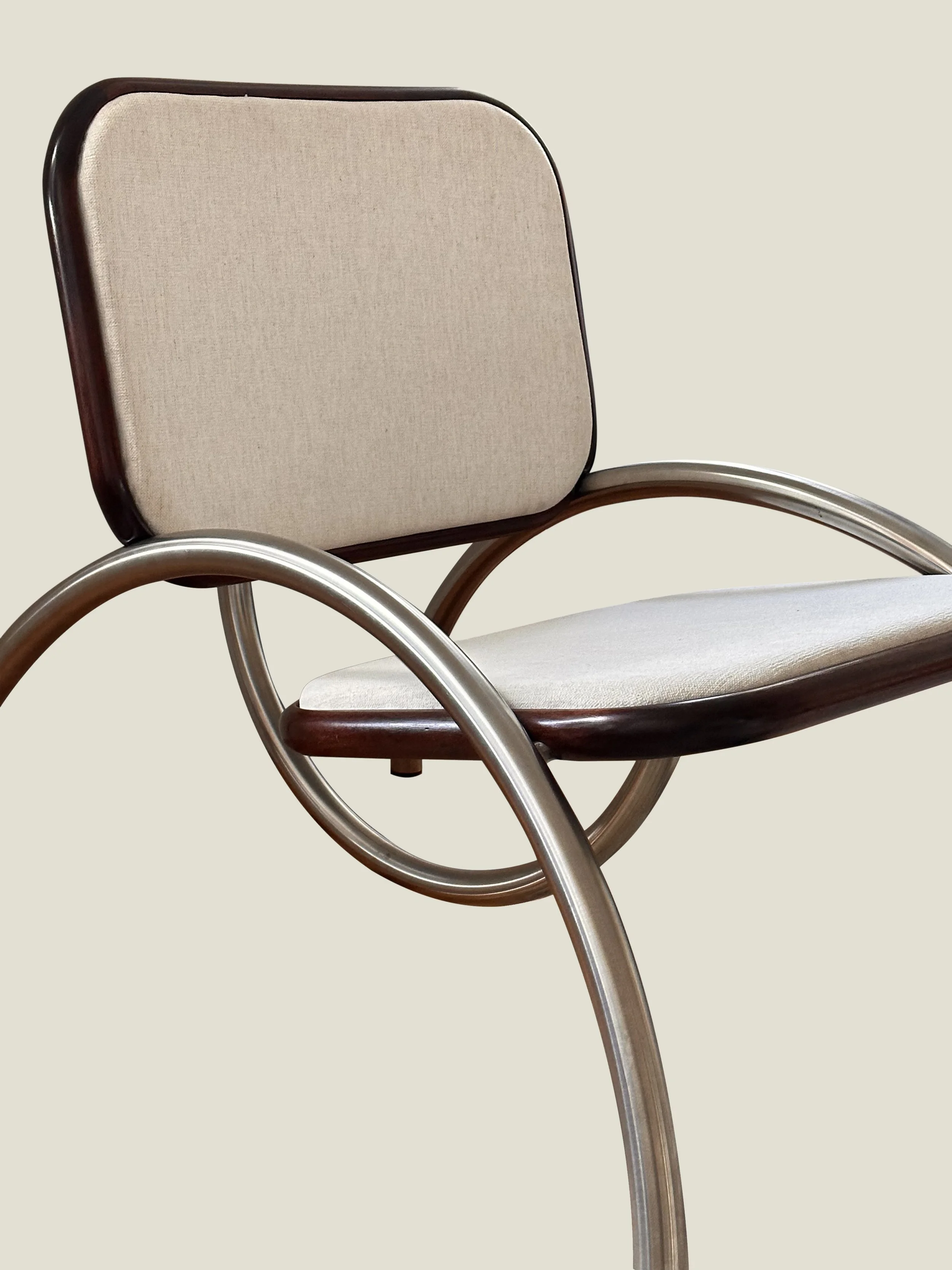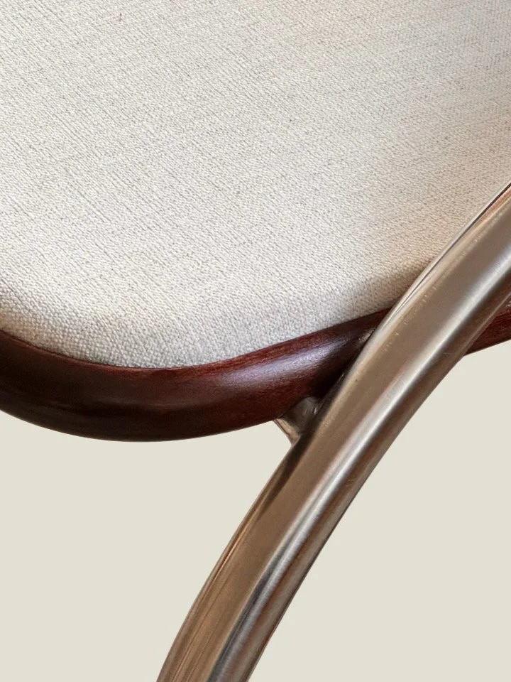 This elegant prototype features rolled steel tube, CNC cut, hand finished, solid cherry frames, and delicate linen upholstery.