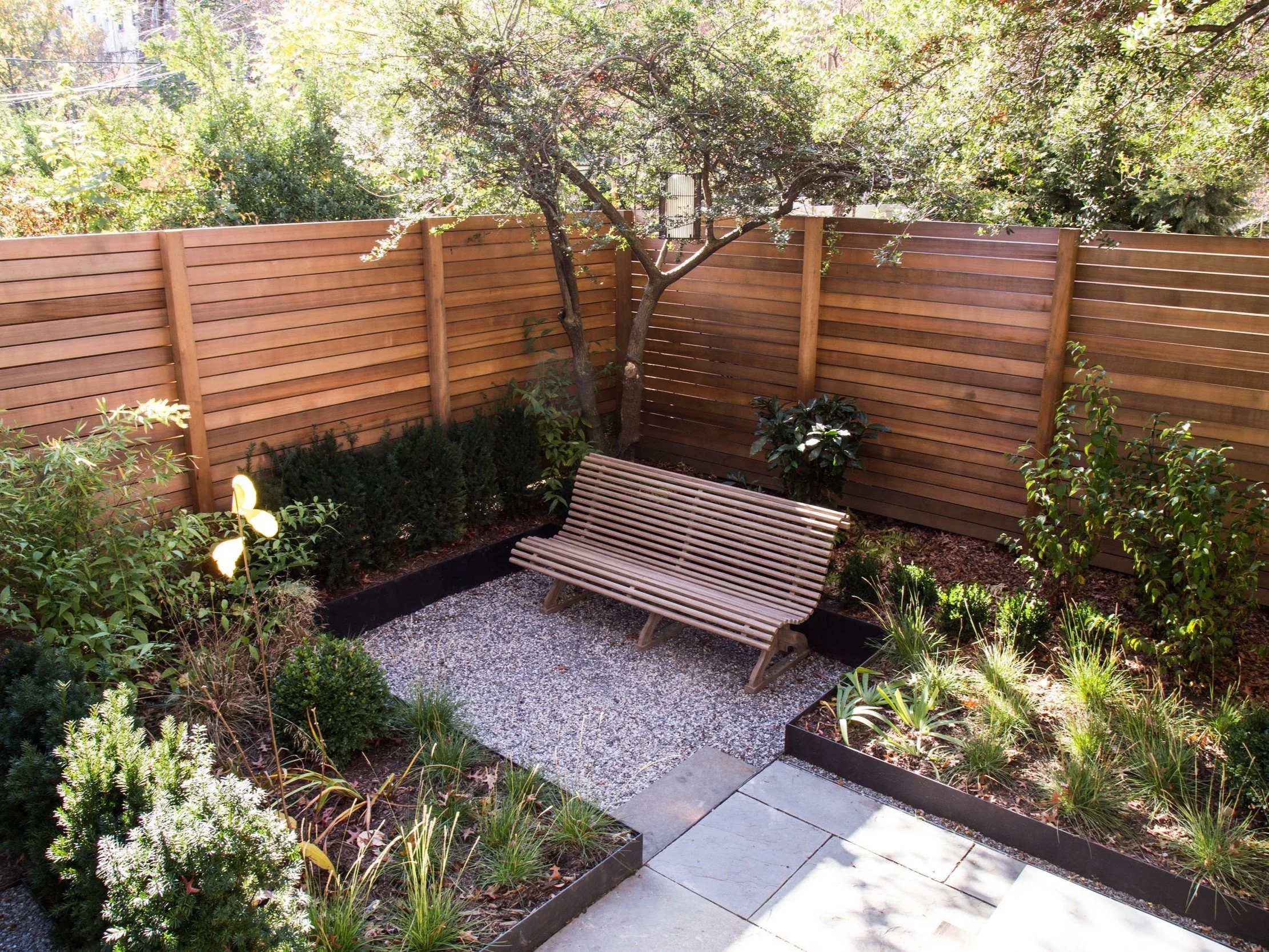The stones for these three custom benches were reclaimed from this brownstone’s garden. The brownstone blocks were salvaged from the original stoop built in the late 19th century.