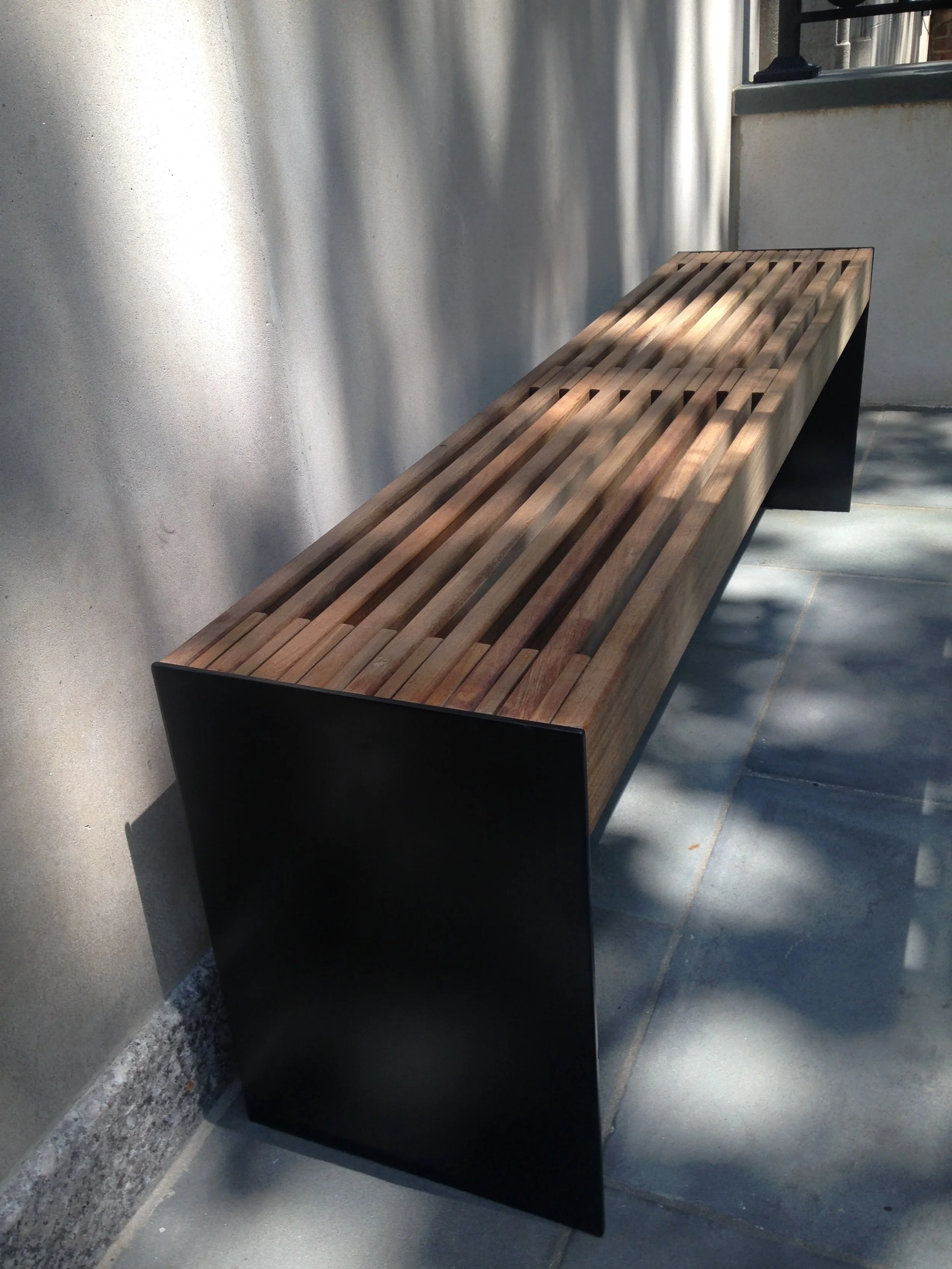 Dry-laid bluestone patio; ipe/steel benches; steel planters with ipe cladding; ipe screens; steel garbage enclosures.